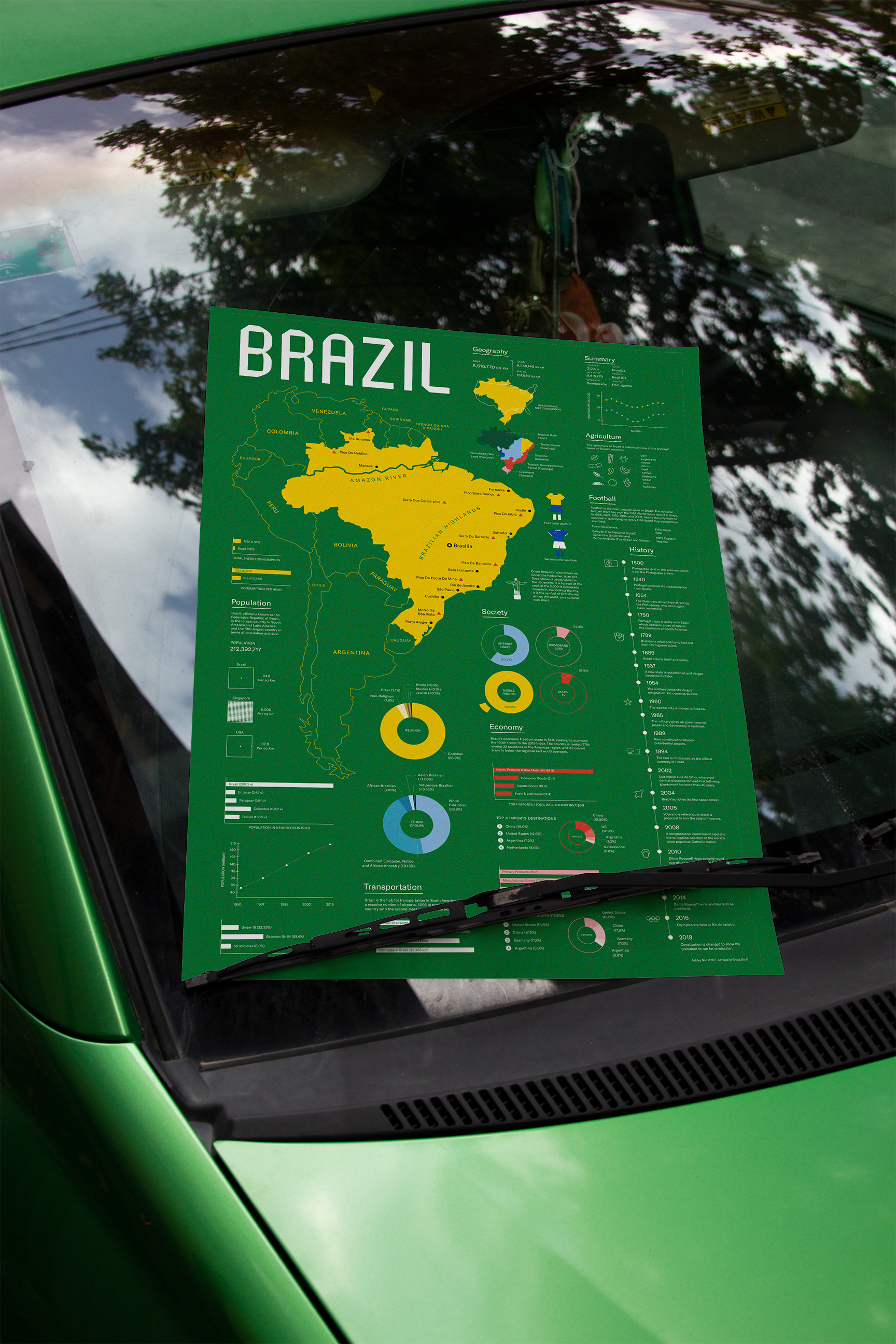 A poster visualizing Brazil’s geography, economy, population, timeline, and more.