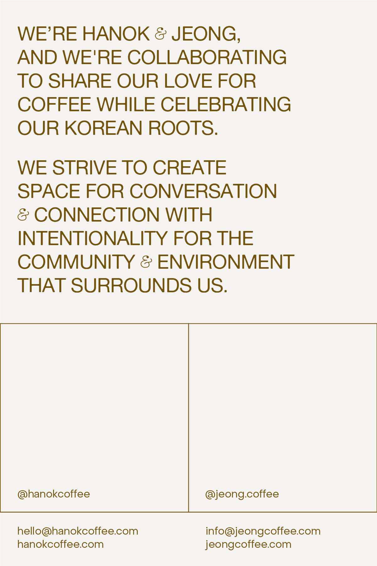 Hanok Coffee and Jeong Coffee were both invited to be a part of a one-day market featuring 22 Korean-American makers. Rather than competing, the two coffee brands chose to collaborate and celebrate their Korean roots. Together, they designed, curated, and worked together to serve as one team.
